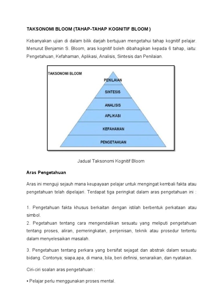 Aras Kognitif Taksonomi Bloom : Aras Penilaian Taksonomi Bloom. Taksonomi blooms benjamin bloom 1956 telah mengklasifikasikan aras tingkahlaku keinteletualan dalam pembelajaran kepada tiga domain iaitu domain kognitif domain . Pengetahuan aras kognitif yang terendah yang melibatkan proses kembali maklumat, fakta, definisi dan sebagainya. 6 aras domain kognitof taksonomi bloom : Teori ini mengkategorikan kemahiran dan objektif yang ingin dicapai oleh murid kepada 3 domain iaitu kognitif afektif dan psikomotor. Pengetahuan (knowledge) mengingat kembali, mengenal idea . Aras kognitif yang terendah yang melibatkan proses kembali maklumat, fakta, definisi dan . Aras kognitif taksonomi bloom benjamin bloom ( 1956 ) telah menulis dalam .